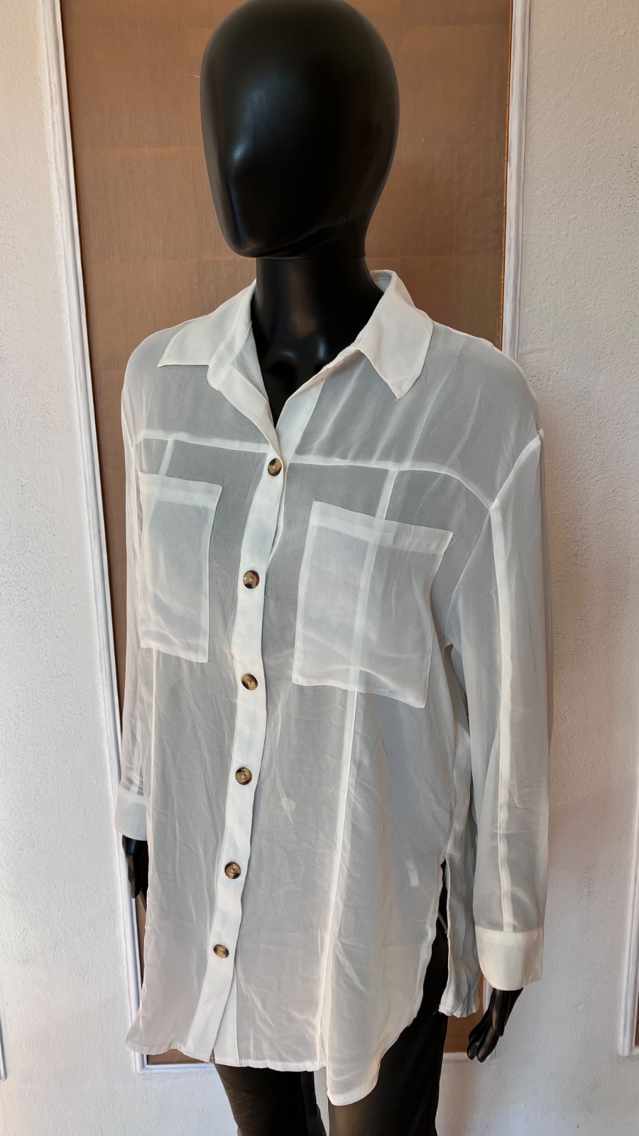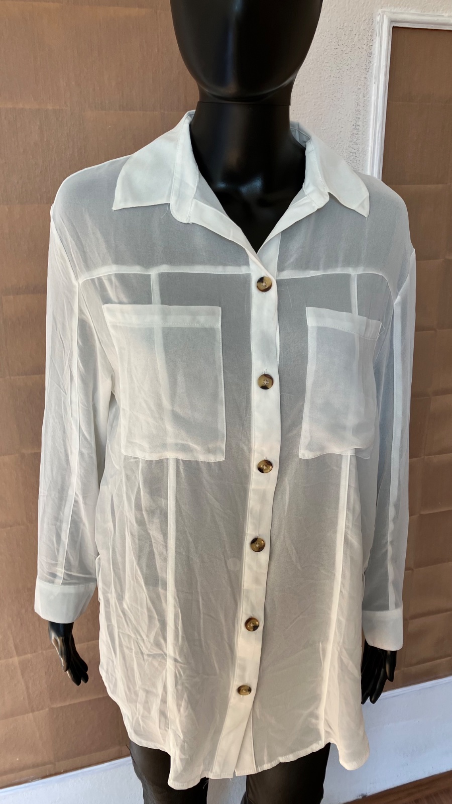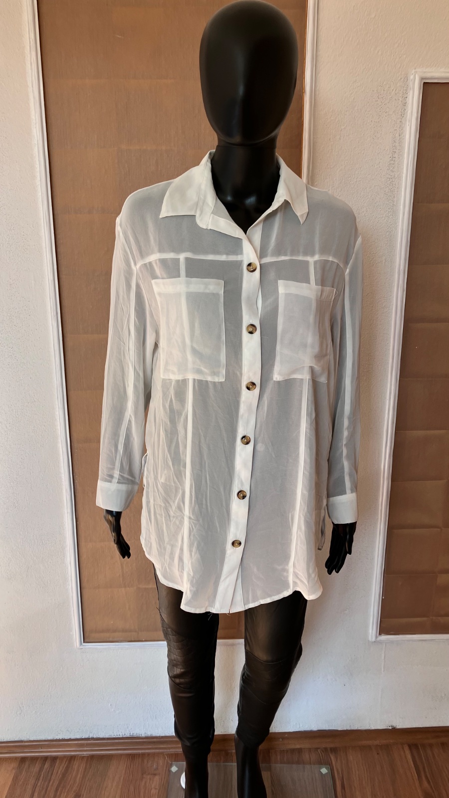 Dámska, dievčenská blúzka s dlhým rukávom, priesvitná, tenká, zapínanie na gombíky, dve predné vrecká na hrudi, veľkosť S/26, nie je elastická, materiál 100%polyester.