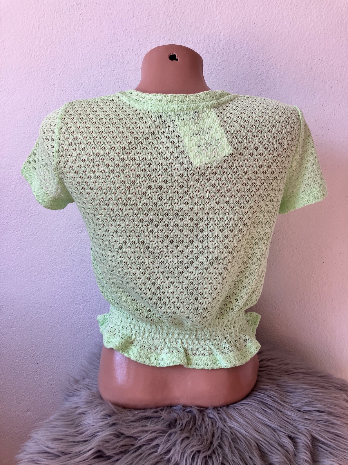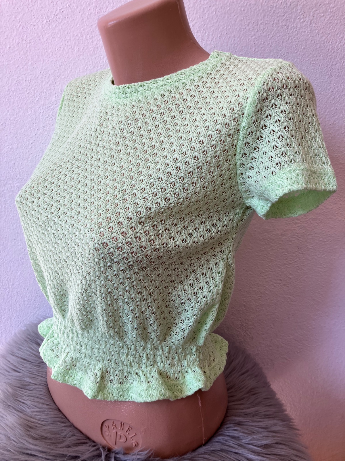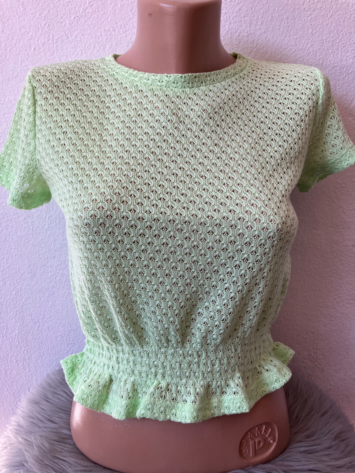 Dámske tričko s krátkym rukávom, háčkované, s okrúhlym výstrihom, elastické, tenké, na spodu s elastickou gumou, veľkosť S (26).