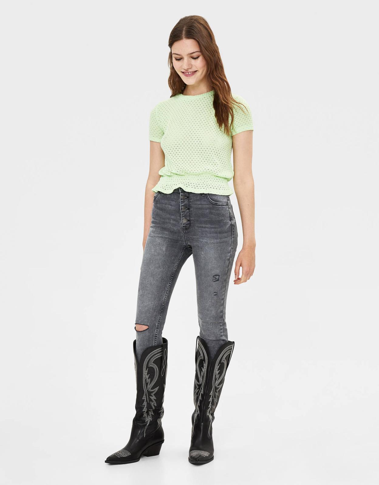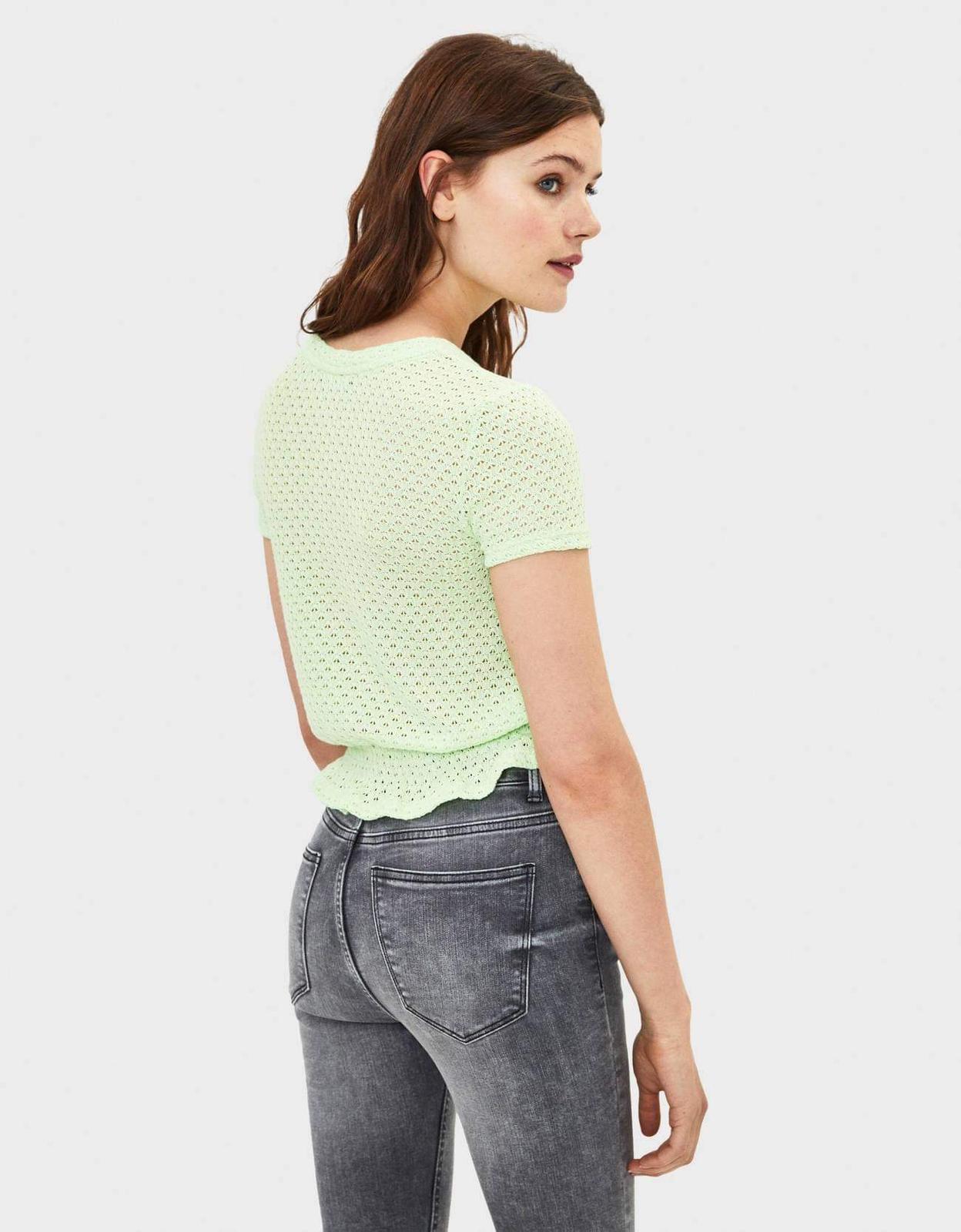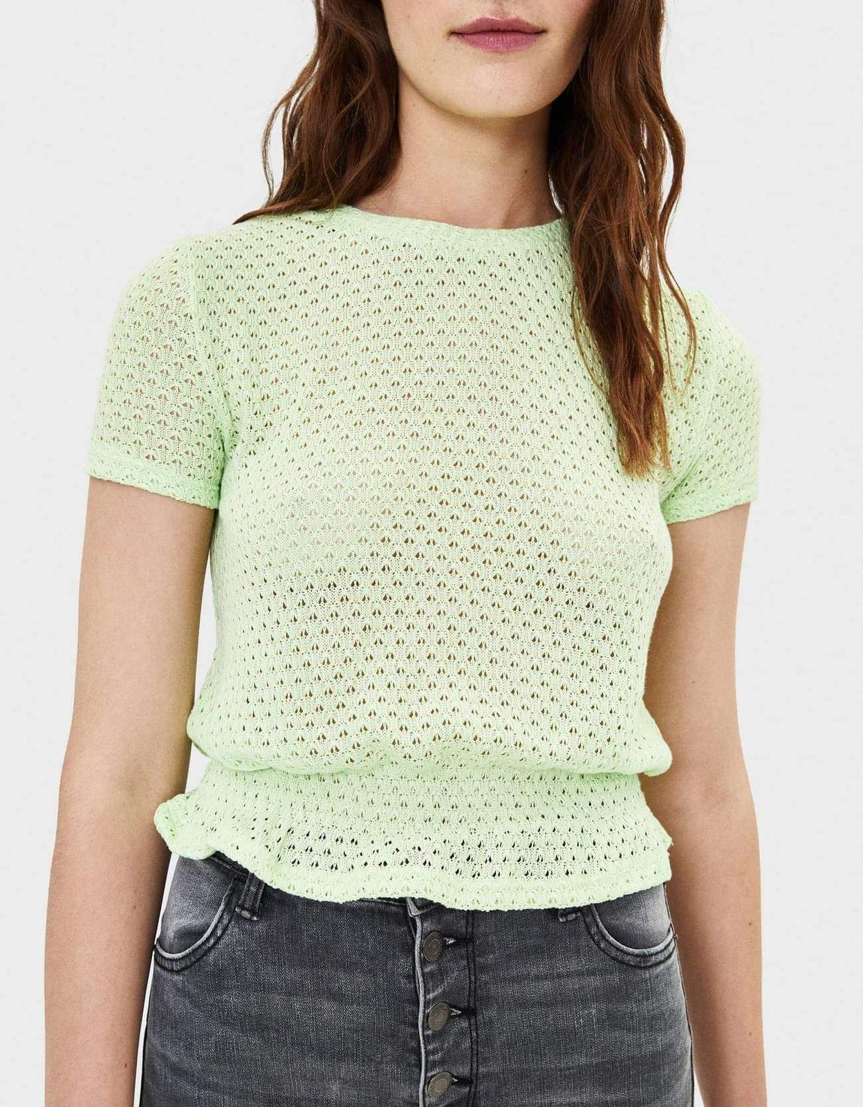 Dámske tričko s krátkym rukávom, háčkované, s okrúhlym výstrihom, elastické, tenké, na spodu s elastickou gumou, veľkosť S (26).