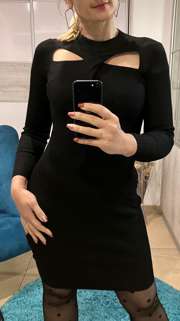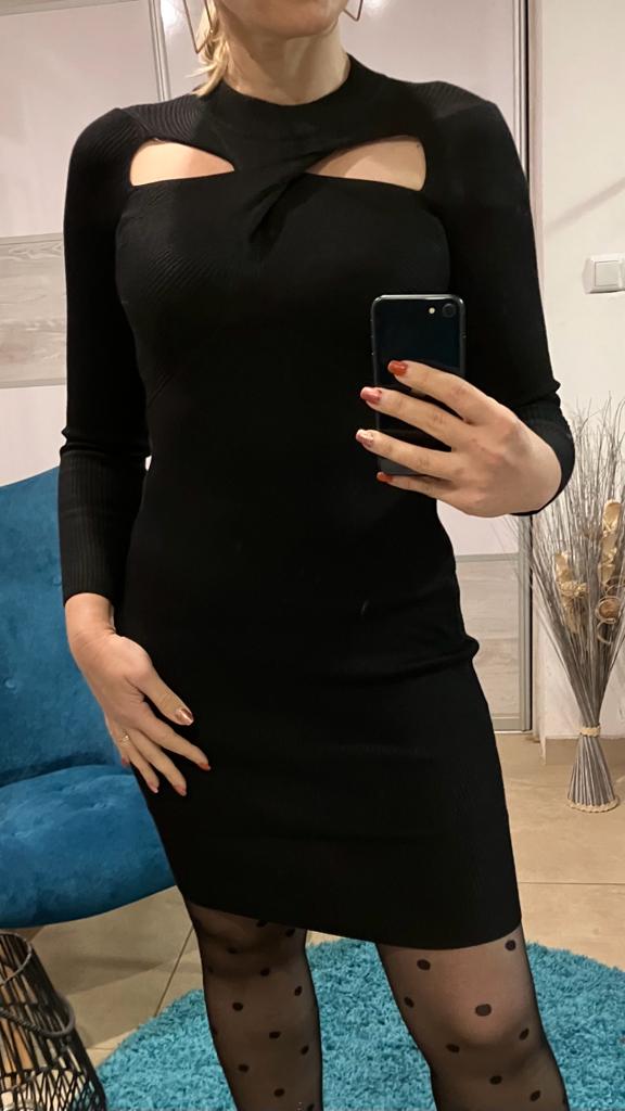 Pohodlné štýlové úpletové šaty s výstrihom na hrudi a dlhým rukávom. Elastické. Šaty sú krásneho obtiahnutého strihu ktorý sa pekne prispôsobí postave. Materiál:70% viskóza, 30%polyamid. Veľkost UNI (S,M,L). Krajina pôvodu:PRC.