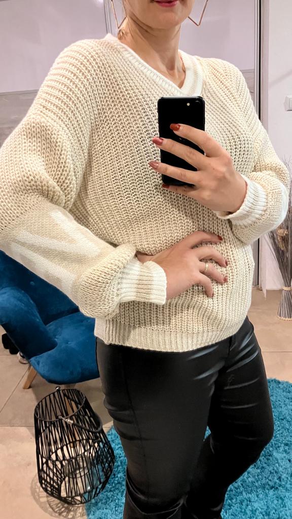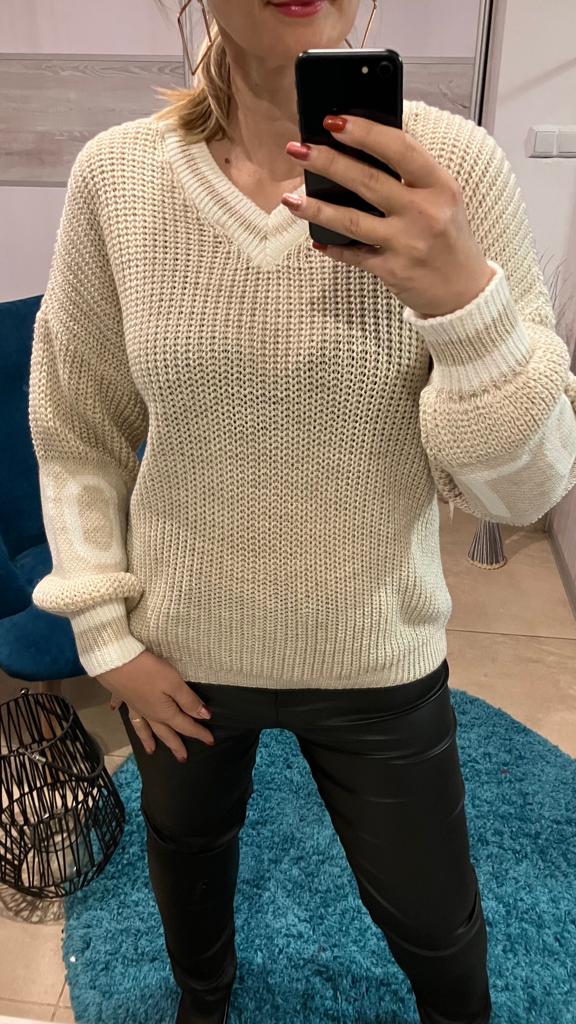 Dámsky voľný štýlový sveter v bielo-béžovej kombinácii farieb. Ležerný strih, hrubší, vpredu - vzadu hladký vzor , véčkový výstrih, zaujímavý rukáv, na rukáve nápis LOVE. Materiál 100%acryl. Veľkosť UNI (S,M,L,XL). Krajina pôvodu: Taliansko.