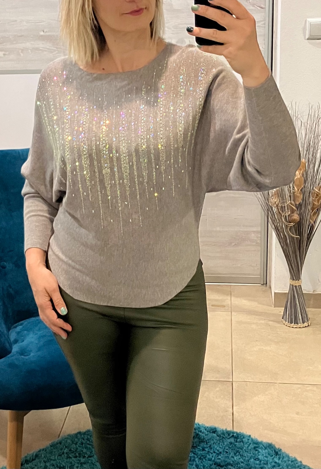 Dámsky sveter s kamienkami. Tenšia. Elastická. Materiál:52%viskóza,27%polyester,21%polyamid. Veľkosť M/L/XL. Krajina pôvodu: Taliansko.