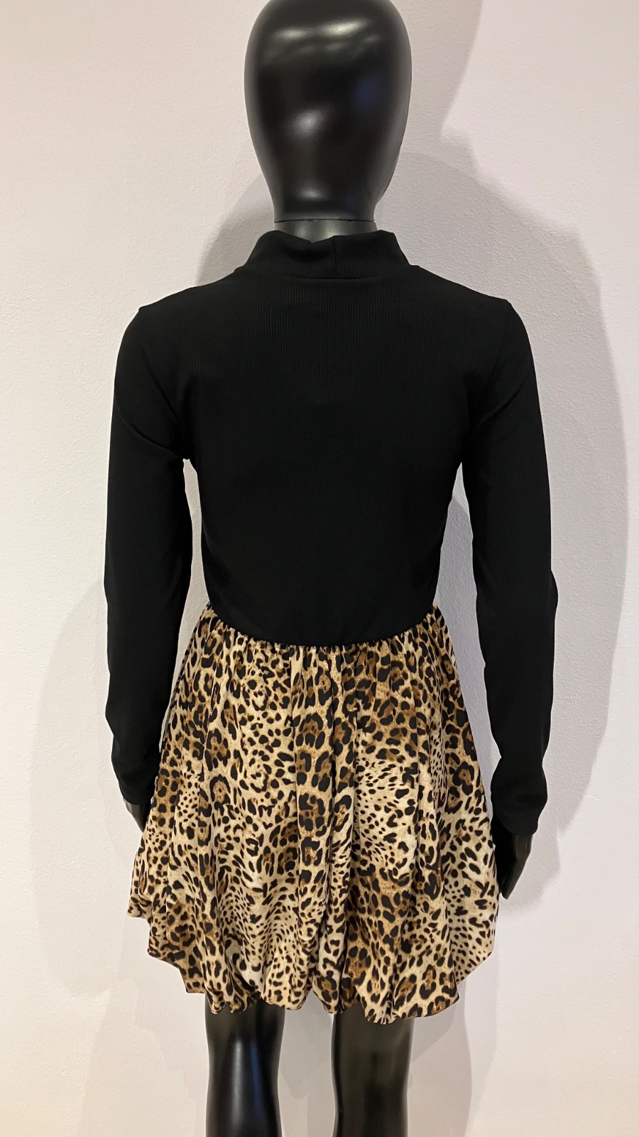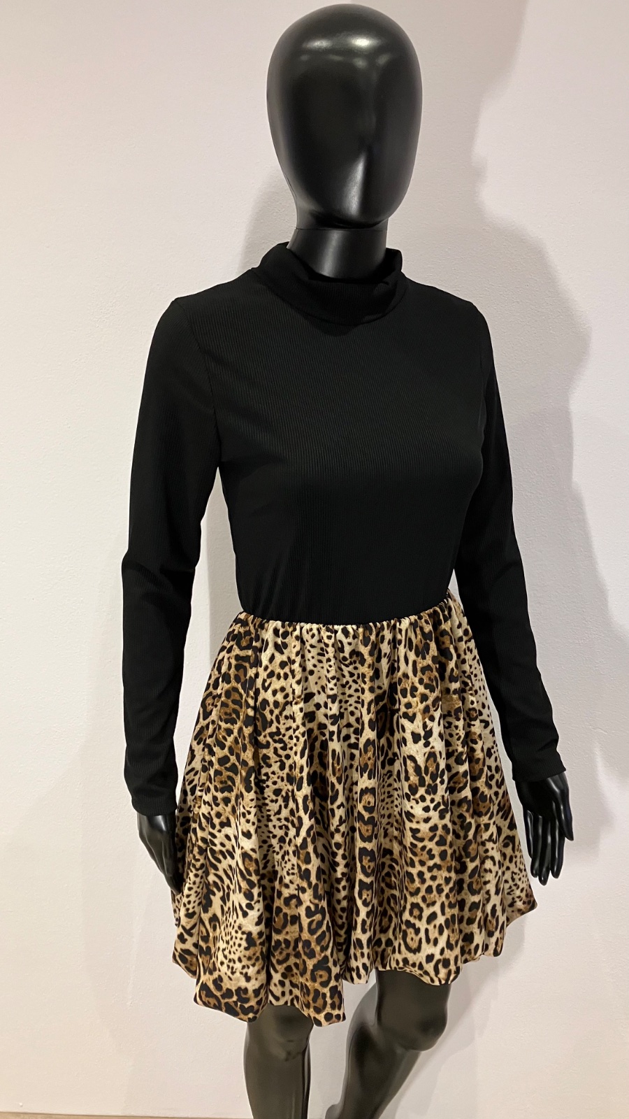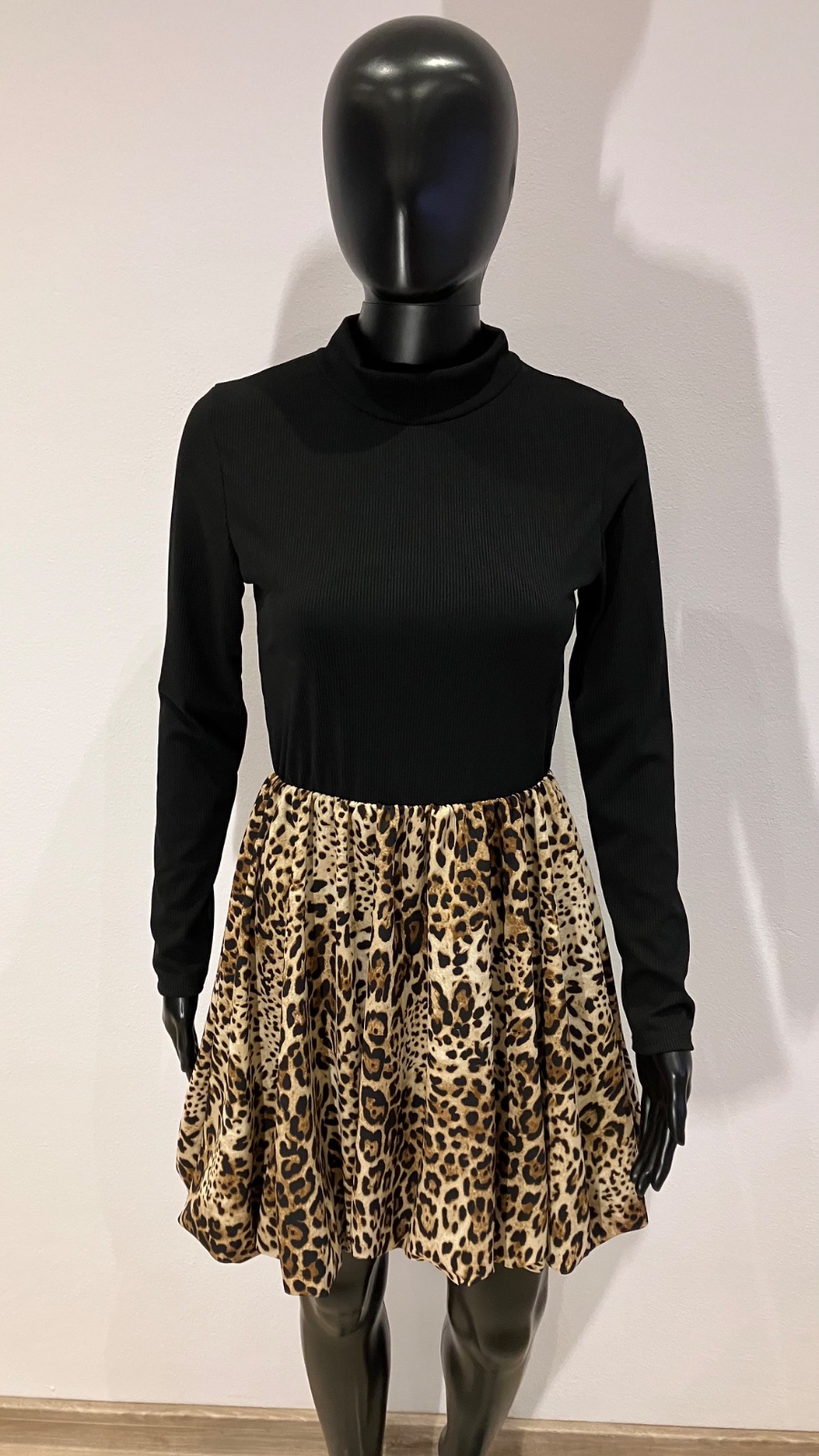 Dámske šaty vrch vrúbkovaný, čierny, s malým rolákom, sukňa s leopardím vzorom, hladká, na spodu s gumou. Elastické, tenké.