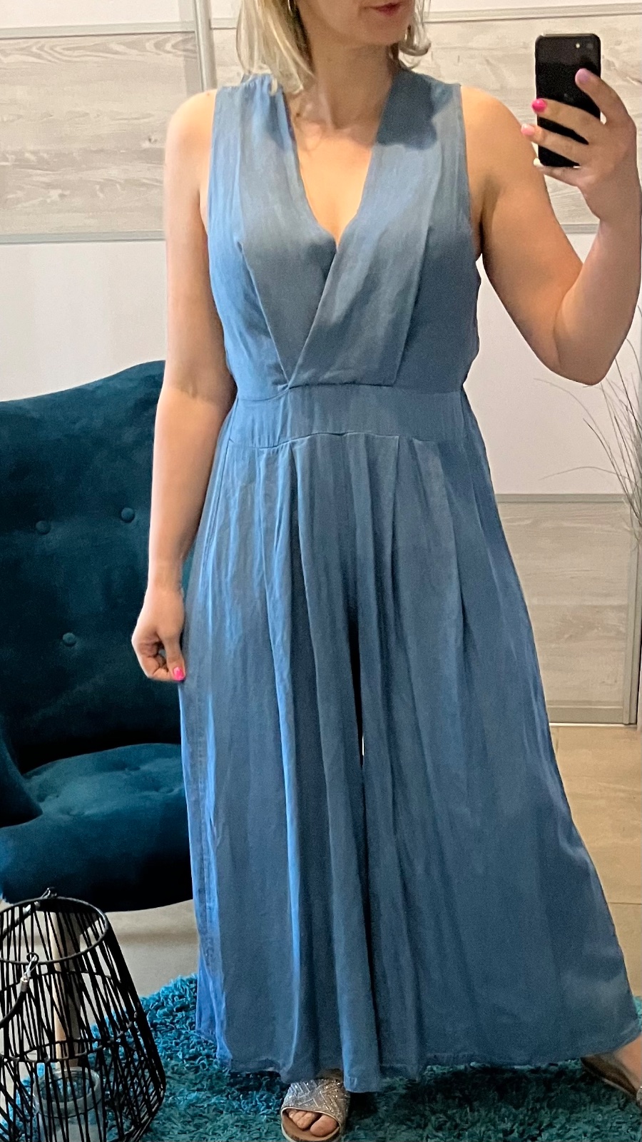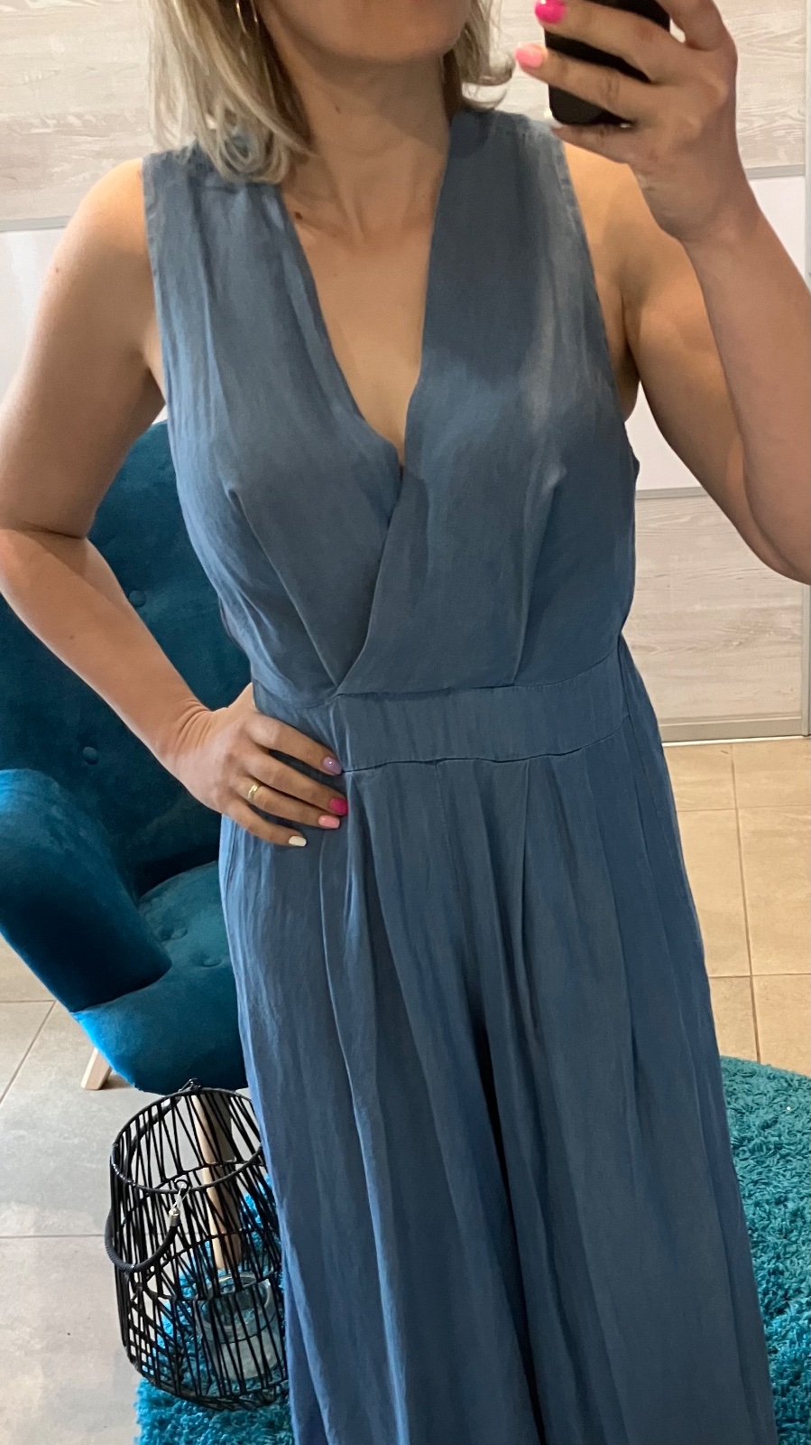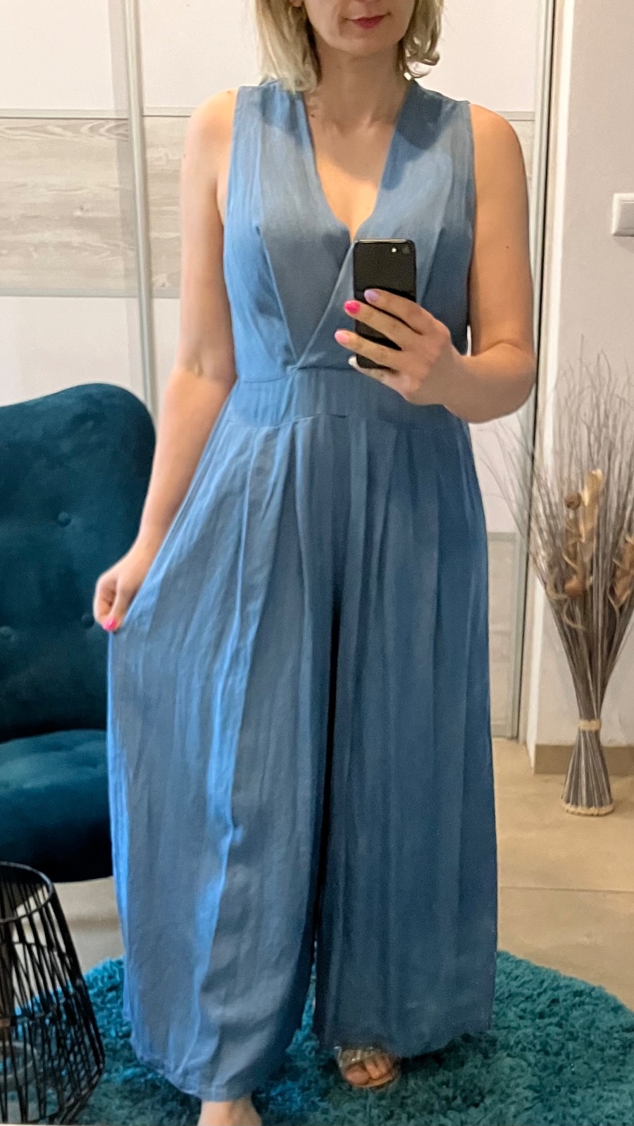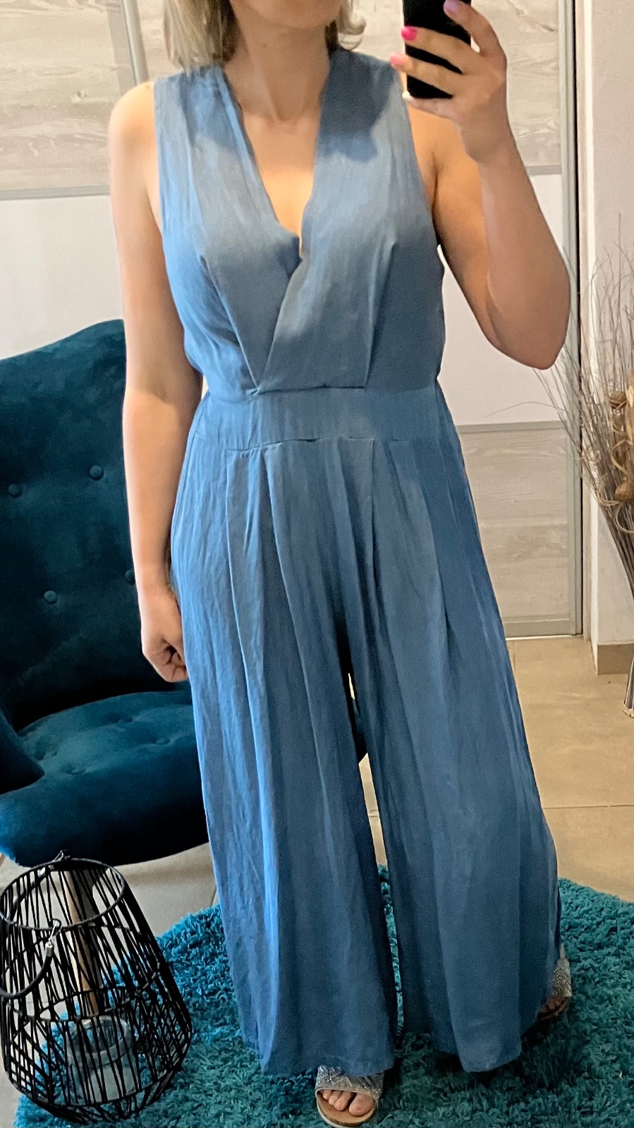 Dámsky tenký rifľový overal so širokými nohavicami. Zapínanie vzadu na jeden gombík. Vzadu guma v páse. Overal nie je elastický. Veľkosť UNI (vhodná pre S,M,L). Krajina pôvodu Taliansko.
