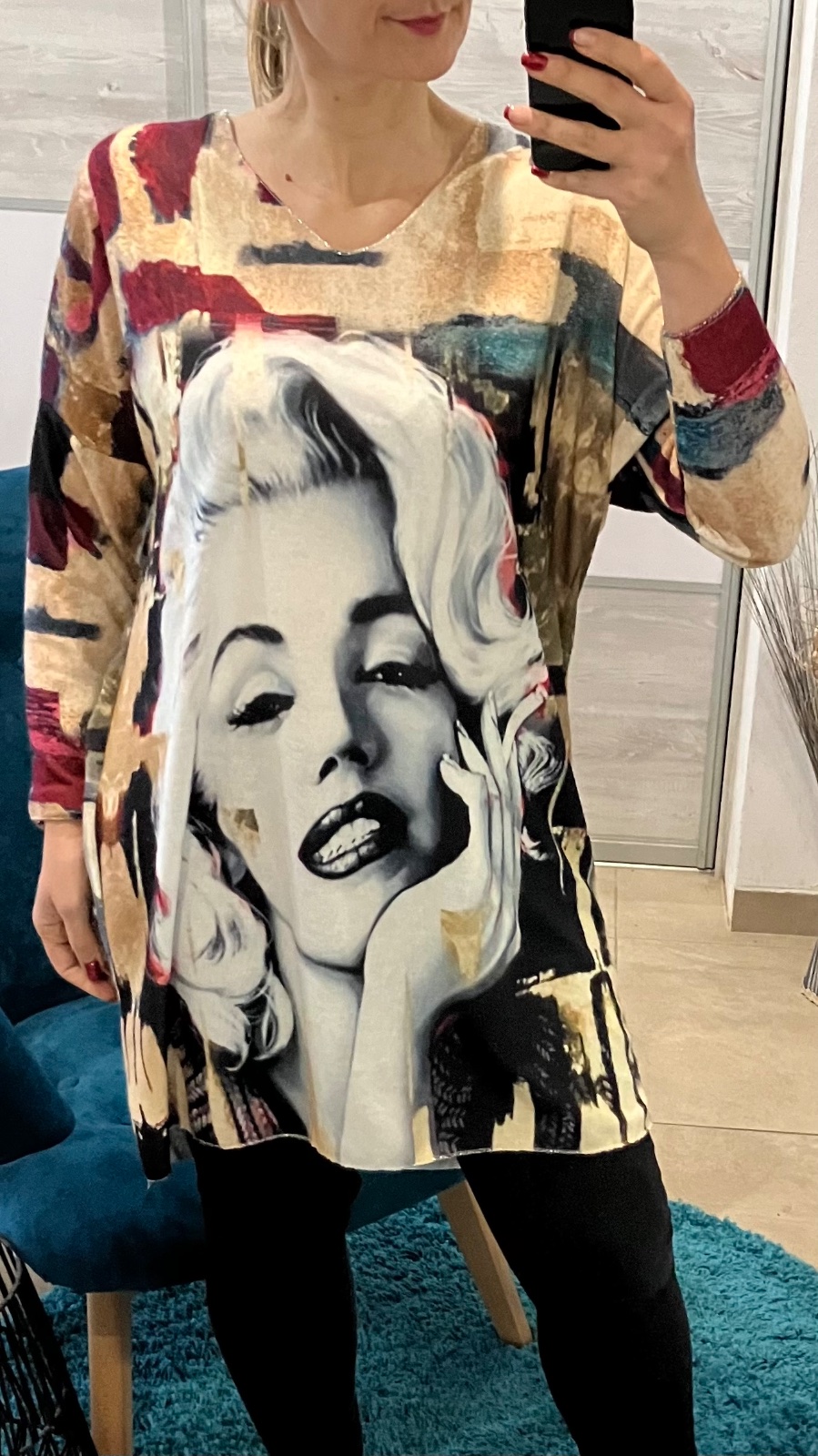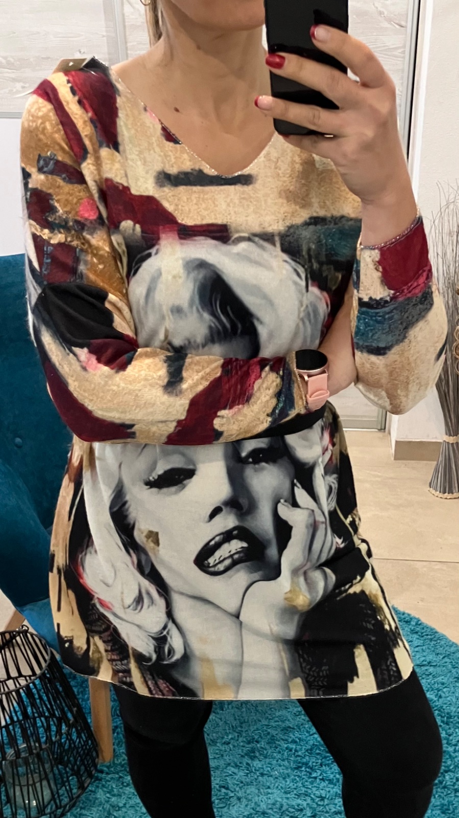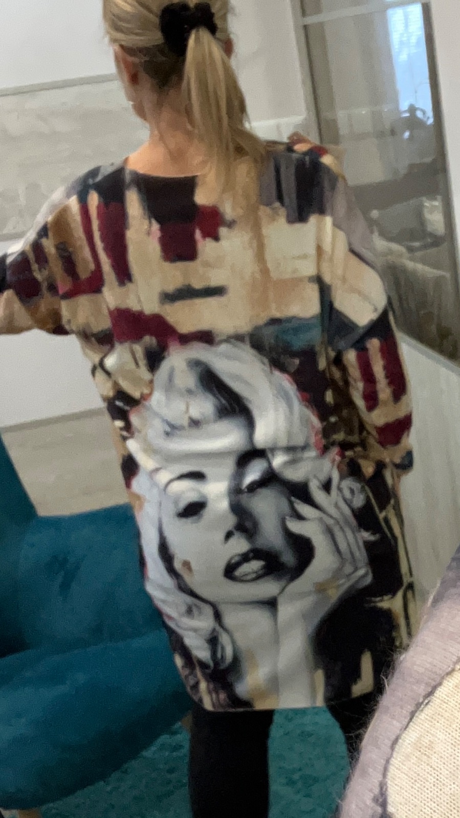 Dámske vzorované predĺžené tričko s dlhým rukávom, tunika, oversize - voľného strihu. Vzor vpredu - vzadu. Mäkučké, svetríkový materiál. Tenké. Elastické.