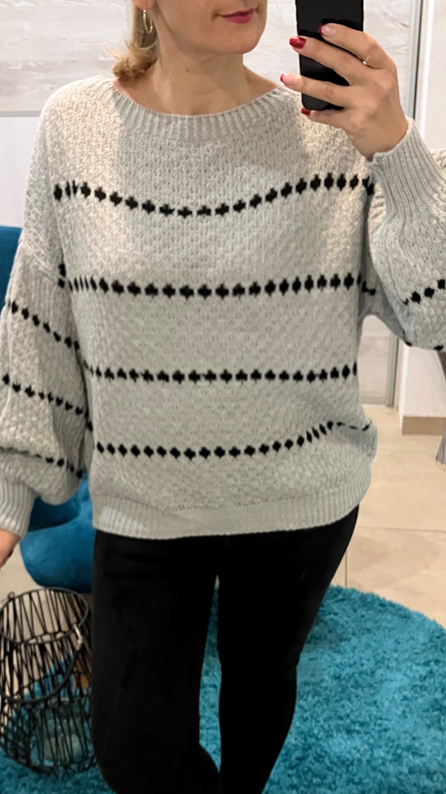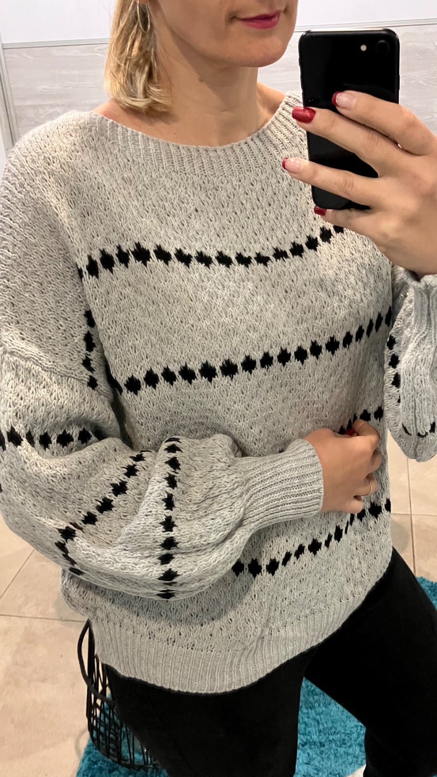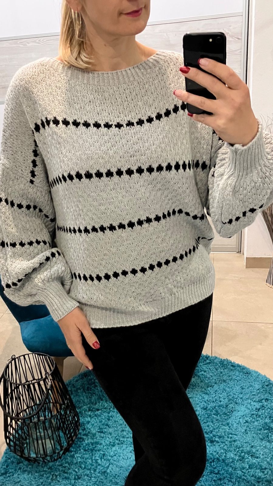 Dámsky voľný štýlový sveter s puff rukávmi , v sivo-čiernej farebnej kombinácií. Vďaka univerzálnej veľkosti sa vie skvelo prispôsobiť postave. Ležérny strih, elastický, tenší. Materiál 100%acryl. Veľkosť UNI (vhodná pre S,M,L,XL). Krajina pôvodu: Taliansko.
