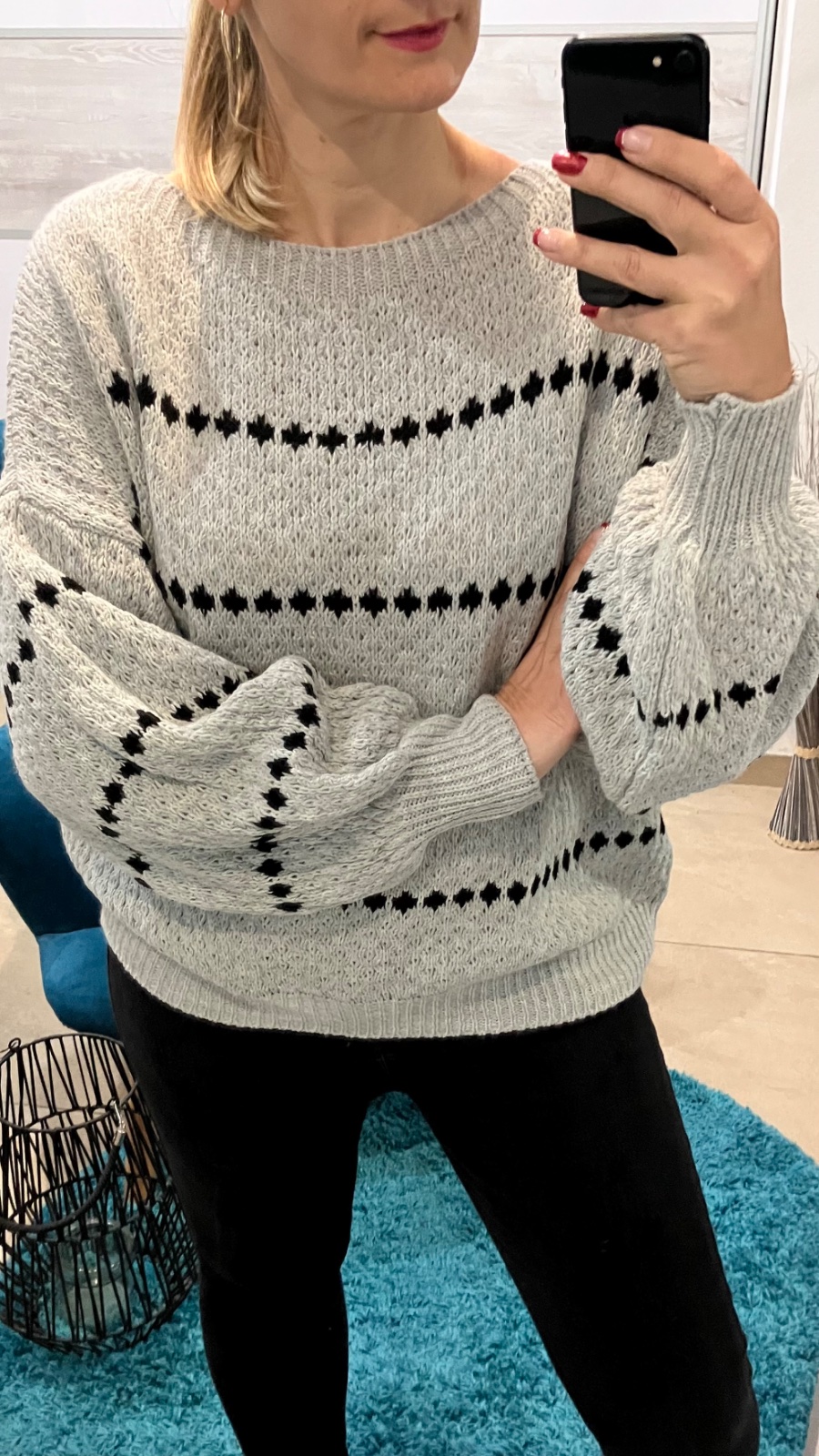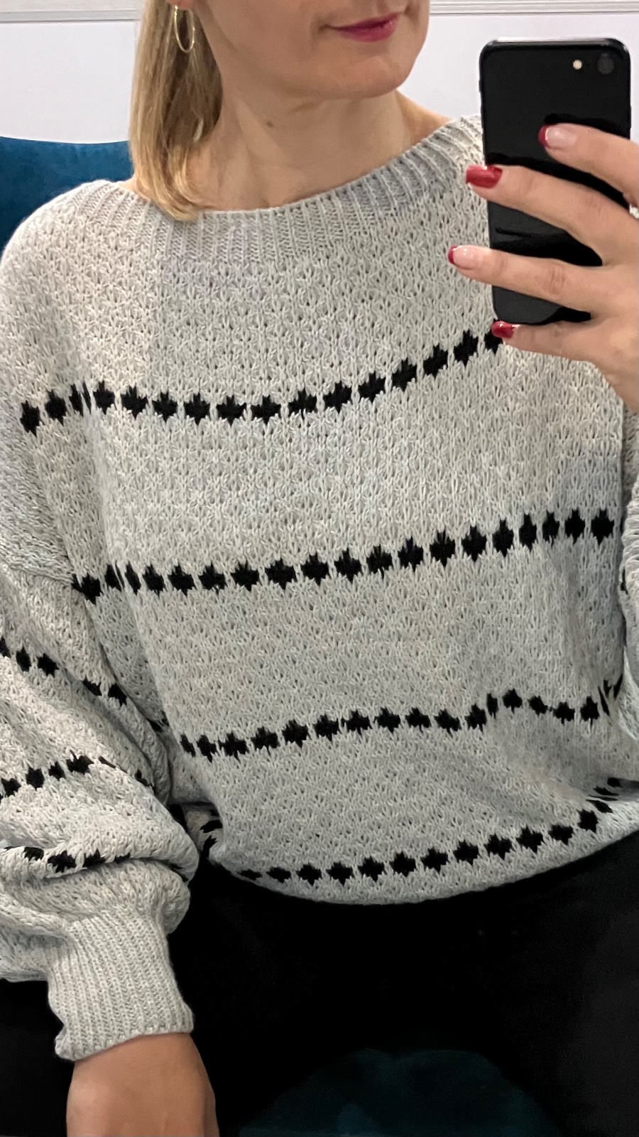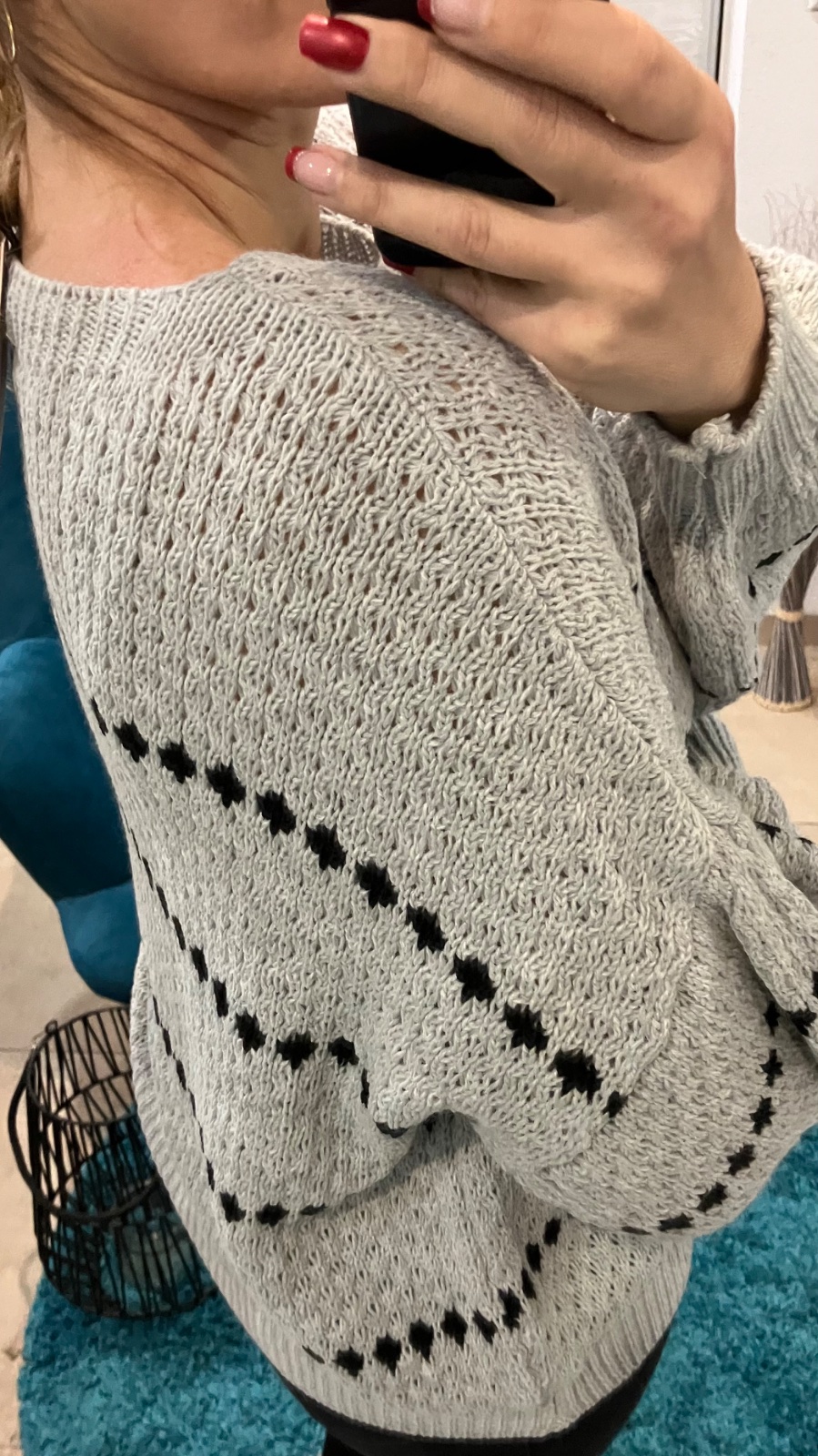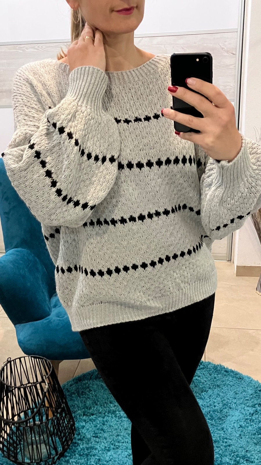 Dámsky voľný štýlový sveter s puff rukávmi , v sivo-čiernej farebnej kombinácií. Vďaka univerzálnej veľkosti sa vie skvelo prispôsobiť postave. Ležérny strih, elastický, tenší. Materiál 100%acryl. Veľkosť UNI (vhodná pre S,M,L,XL). Krajina pôvodu: Taliansko.